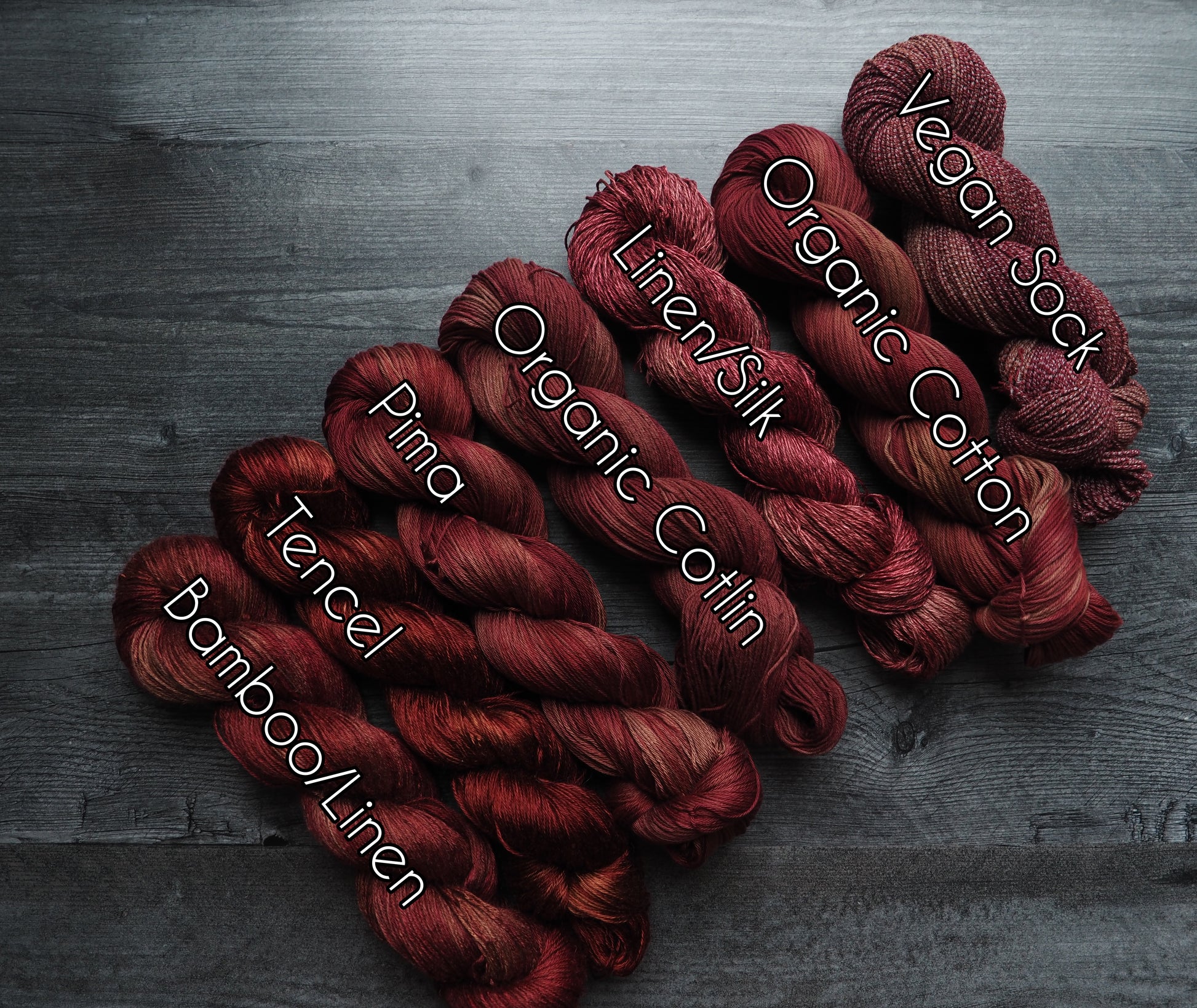 Note: Cotton/Bamboo, Cotton/Linen and Soft Pima are not pictured - Cotton/Bamboo and Soft Pima dye similarly to Organic Cotton, while Cotton/Linen dyes similarly to our old Cotlin base