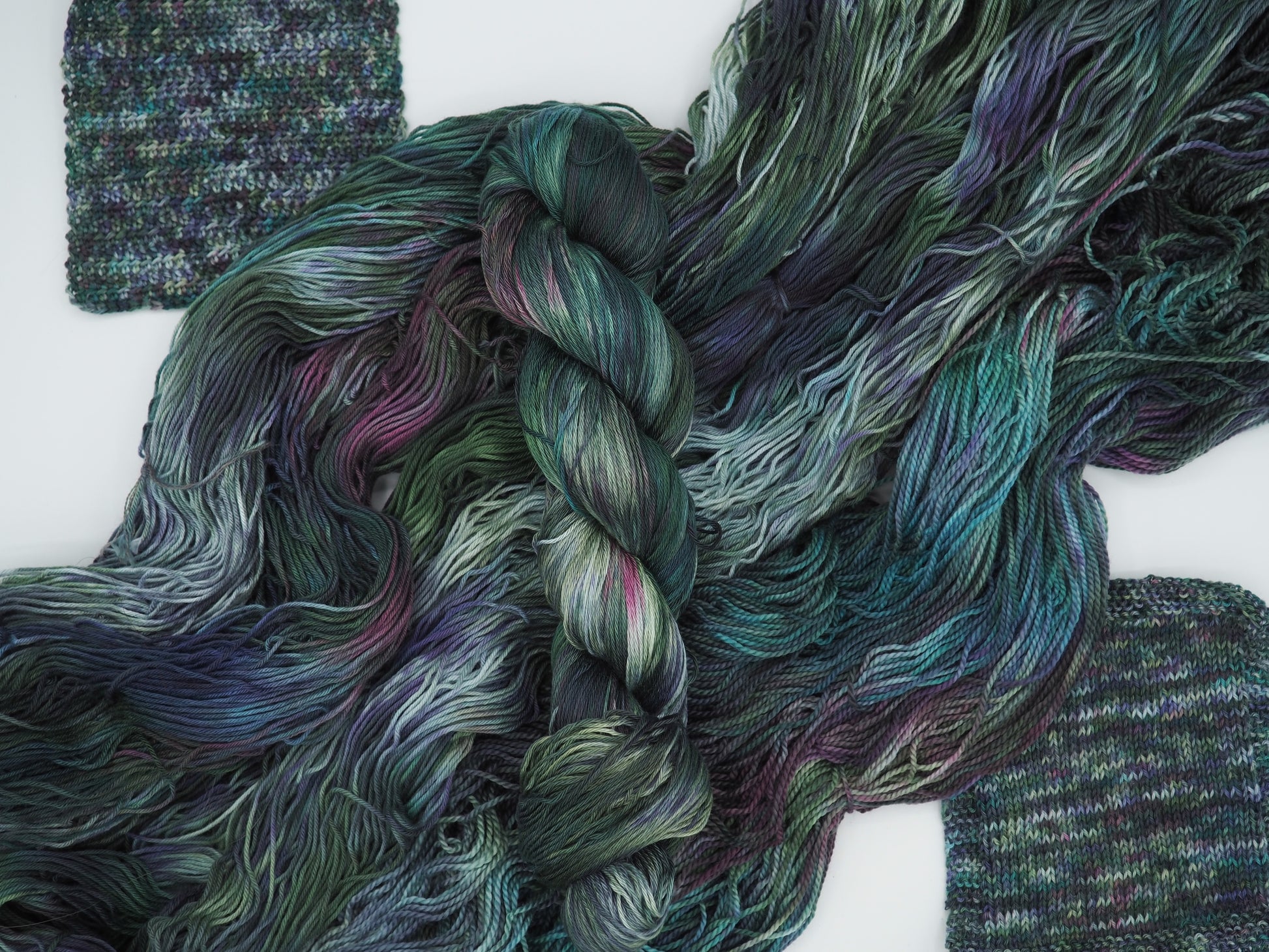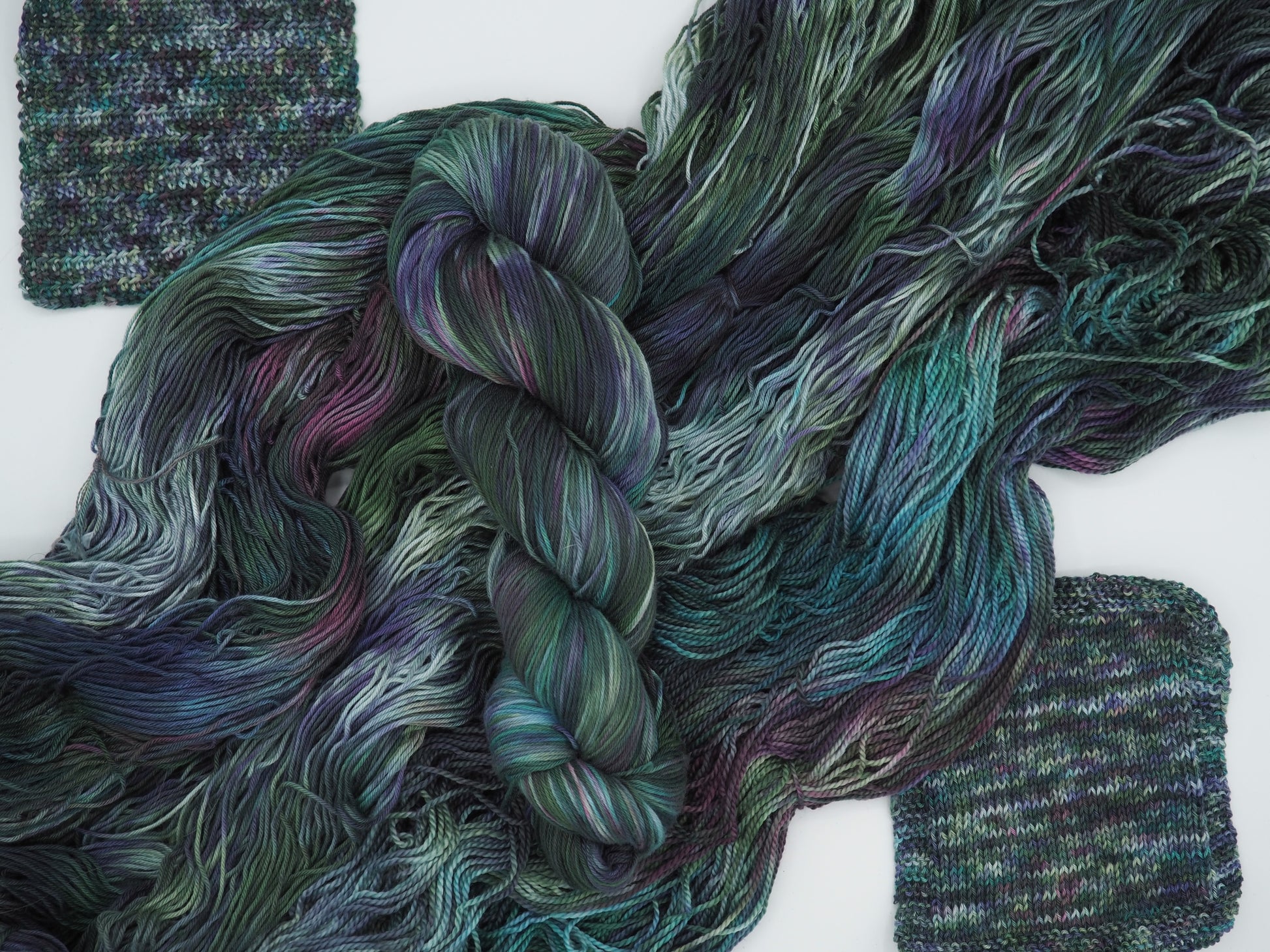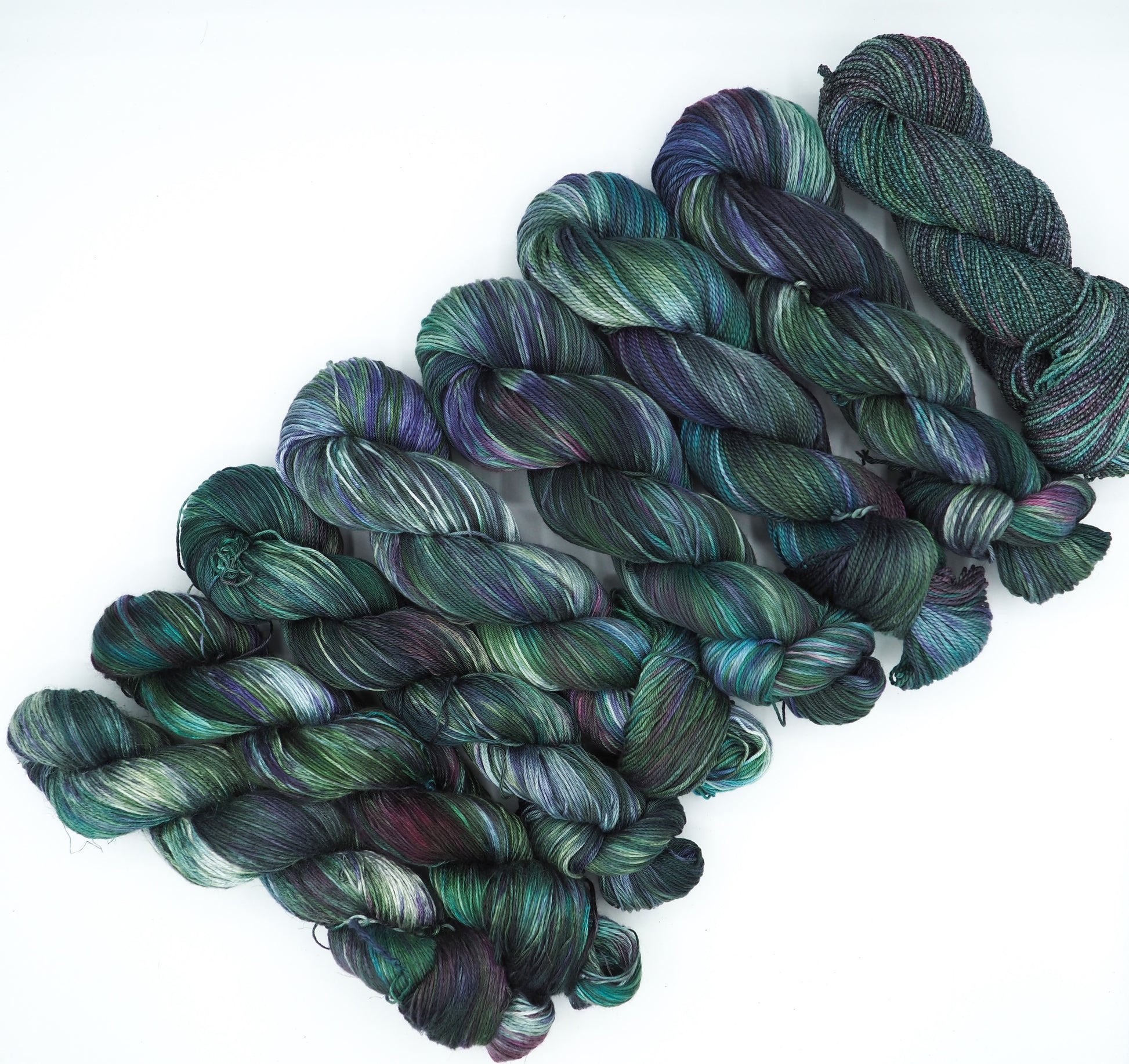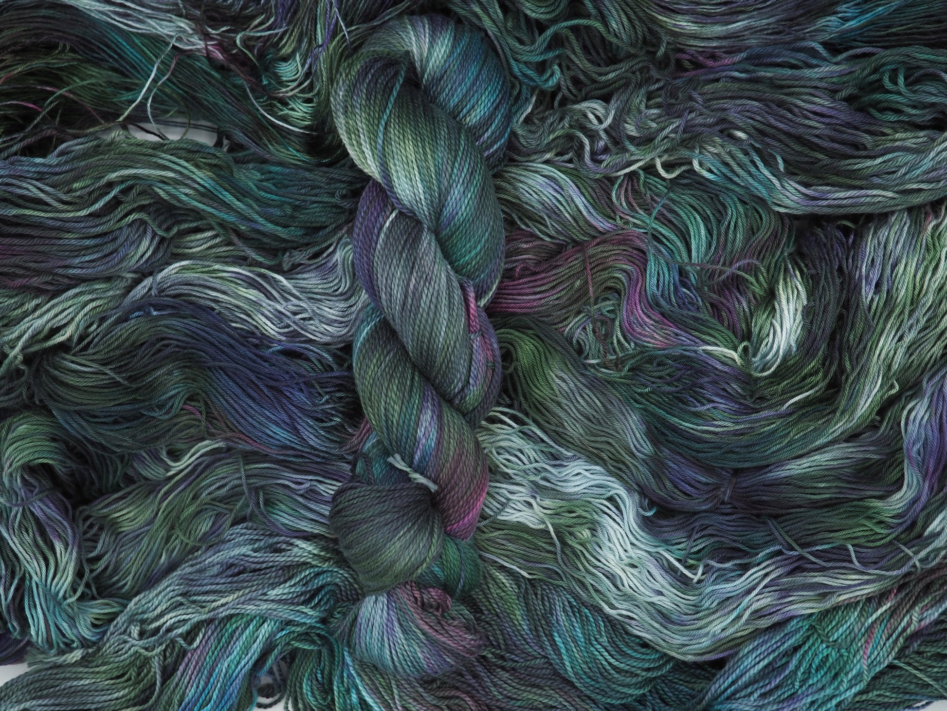 A deep green yarn featuring layers of bright blue, dusty deep pink, soft light greens and cool gray, and grays to moody it up