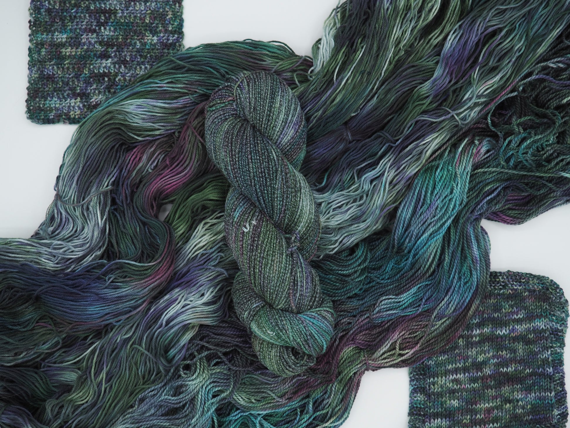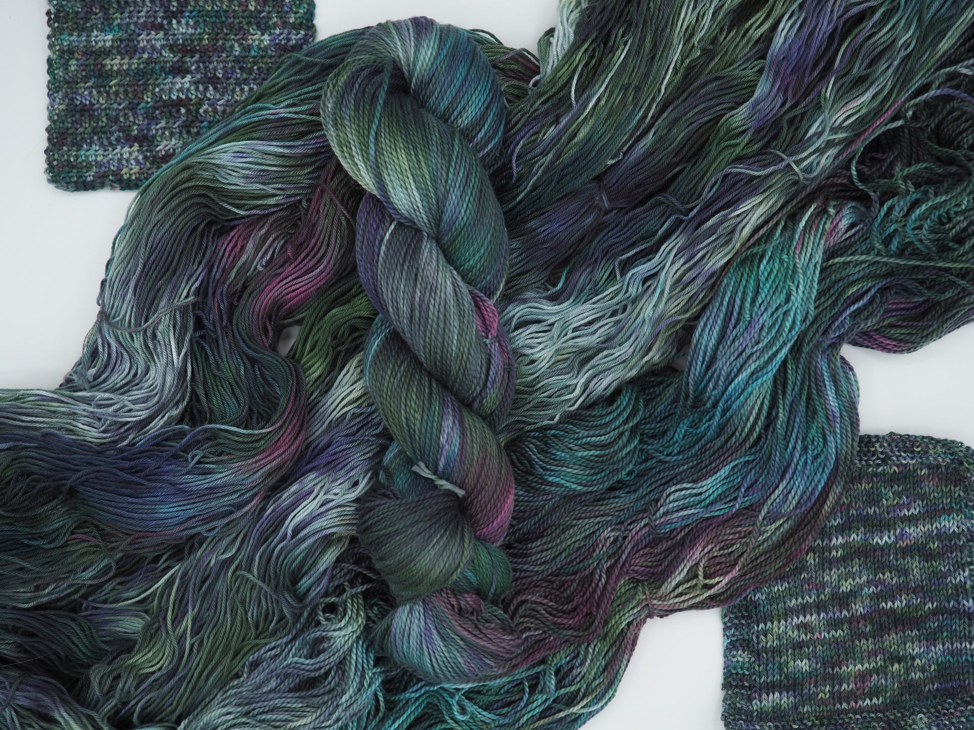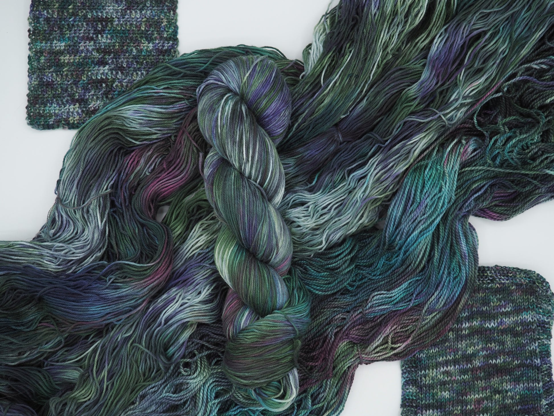 A deep green yarn featuring layers of bright blue, dusty deep pink, soft light greens and cool gray, and grays to moody it up