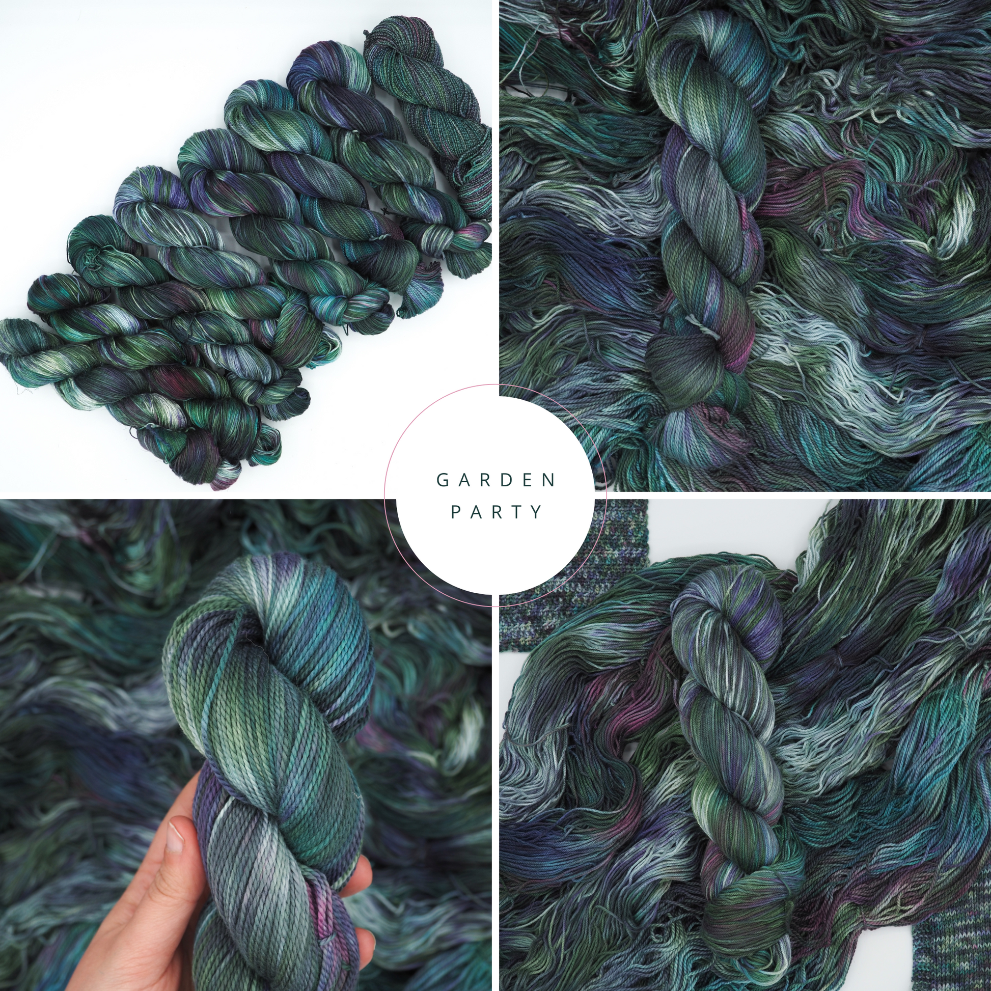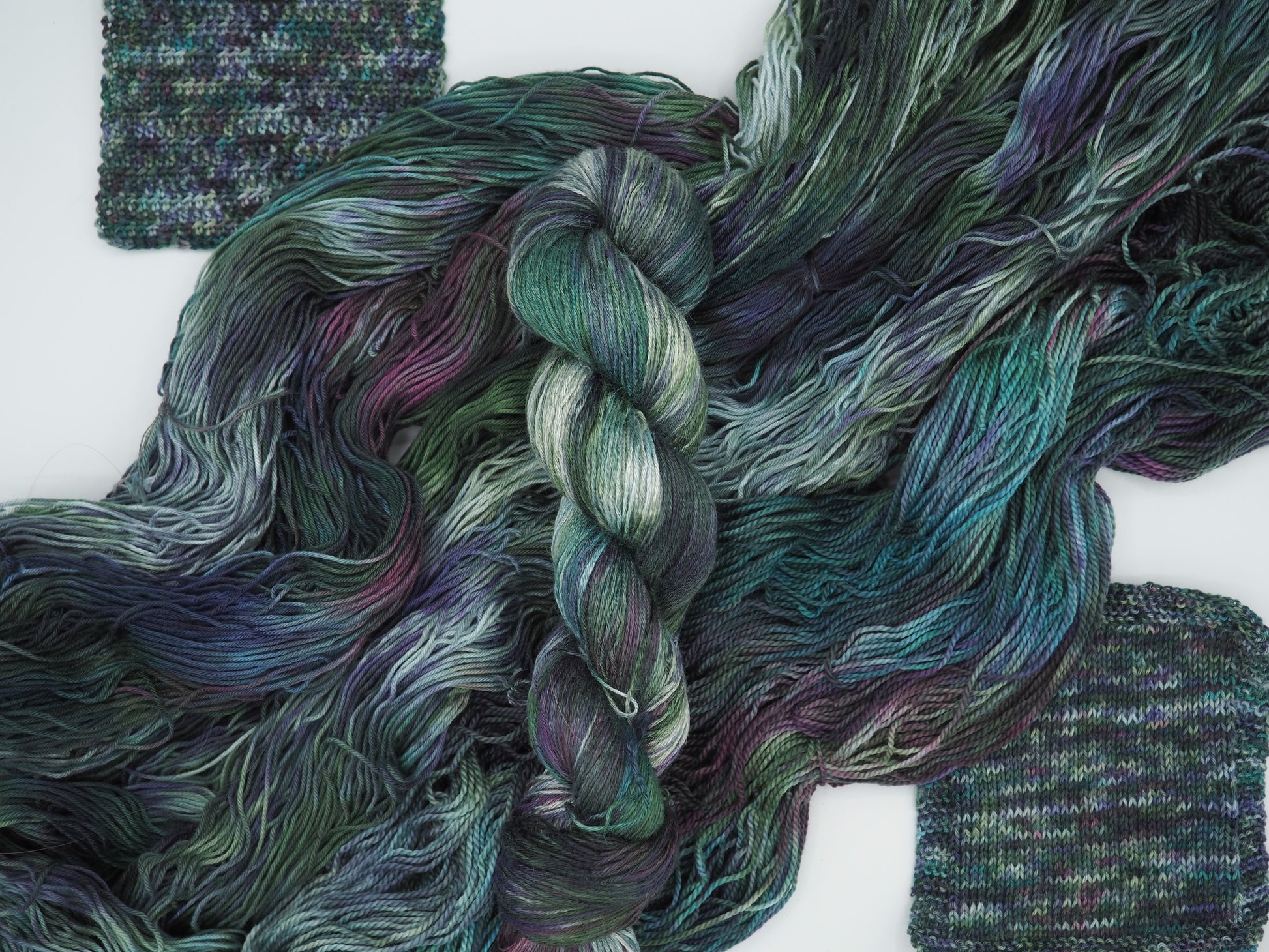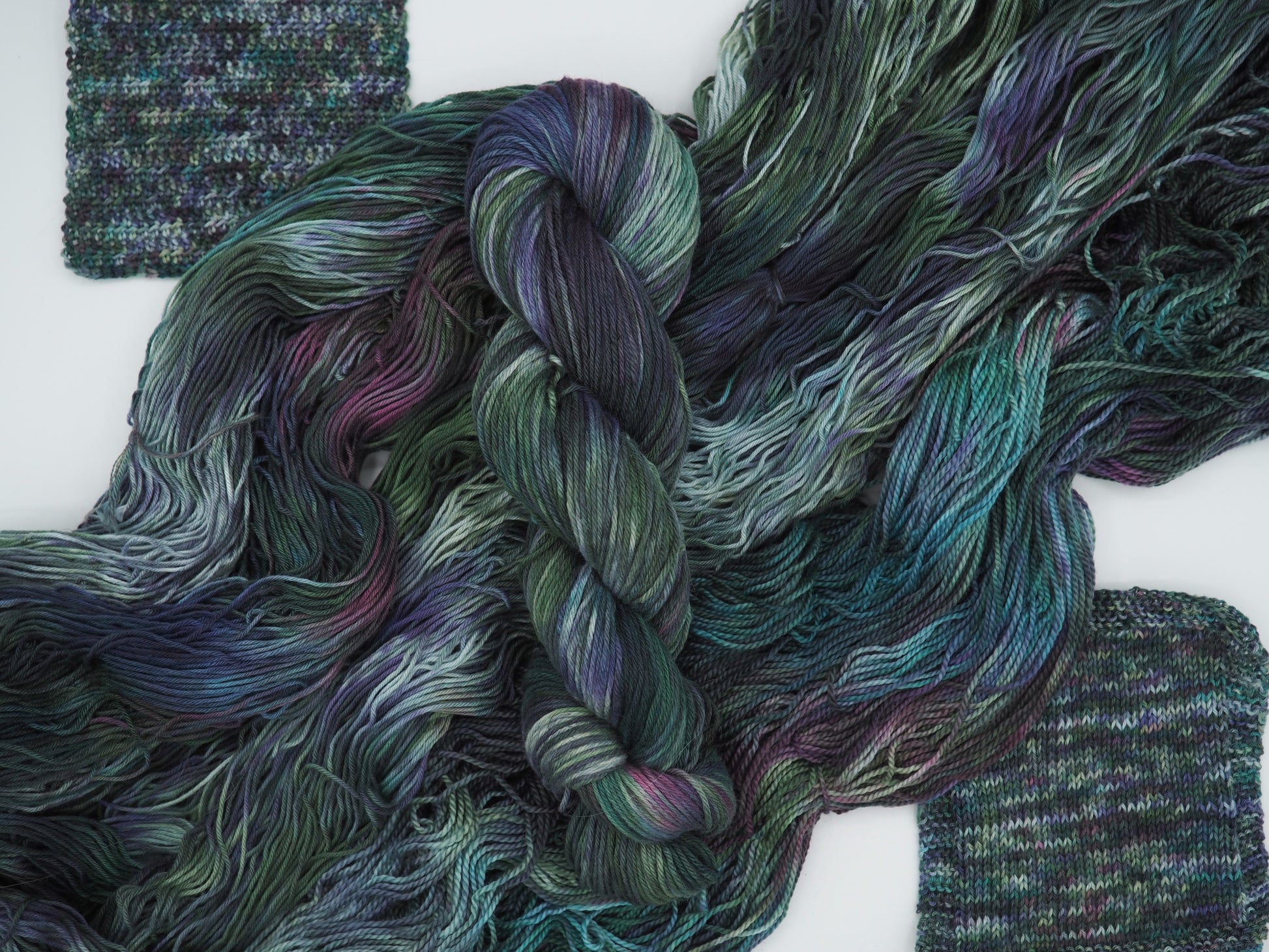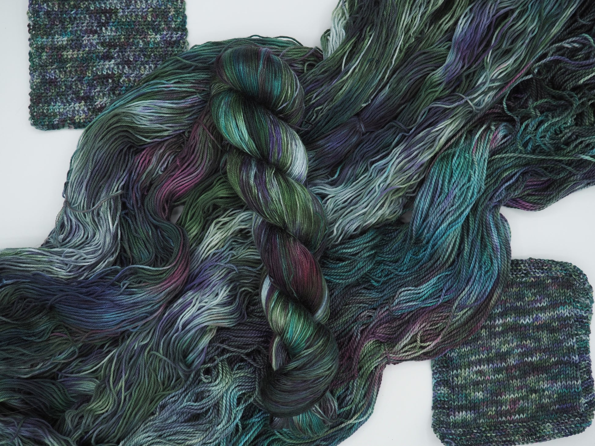 A deep green yarn featuring layers of bright blue, dusty deep pink, soft light greens and cool gray, and grays to moody it up