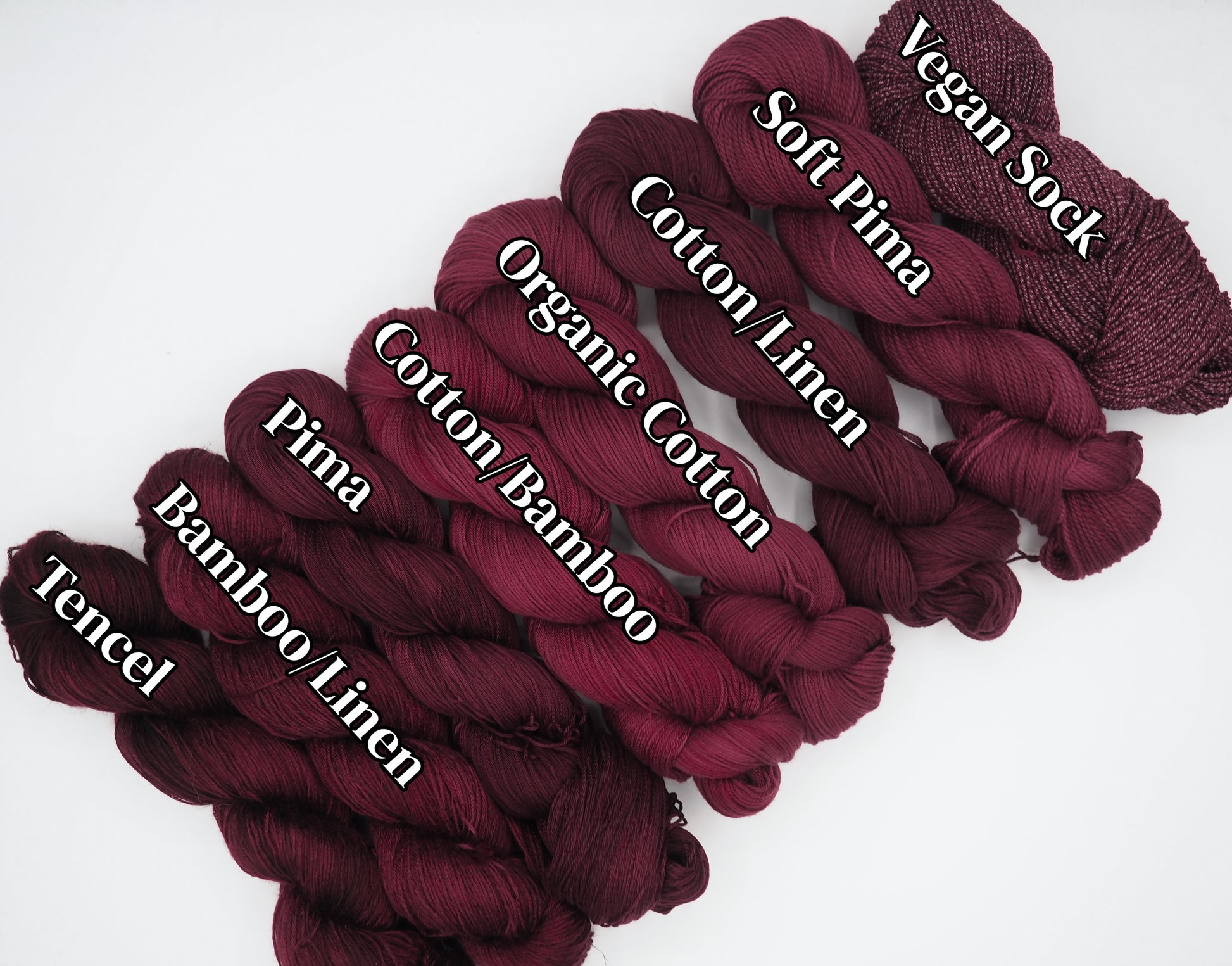 Note: Cotton/Bamboo, Cotton/Linen and Soft Pima are not pictured - Cotton/Bamboo and Soft Pima dye similarly to Organic Cotton, while Cotton/Linen dyes similarly to our old Cotlin base